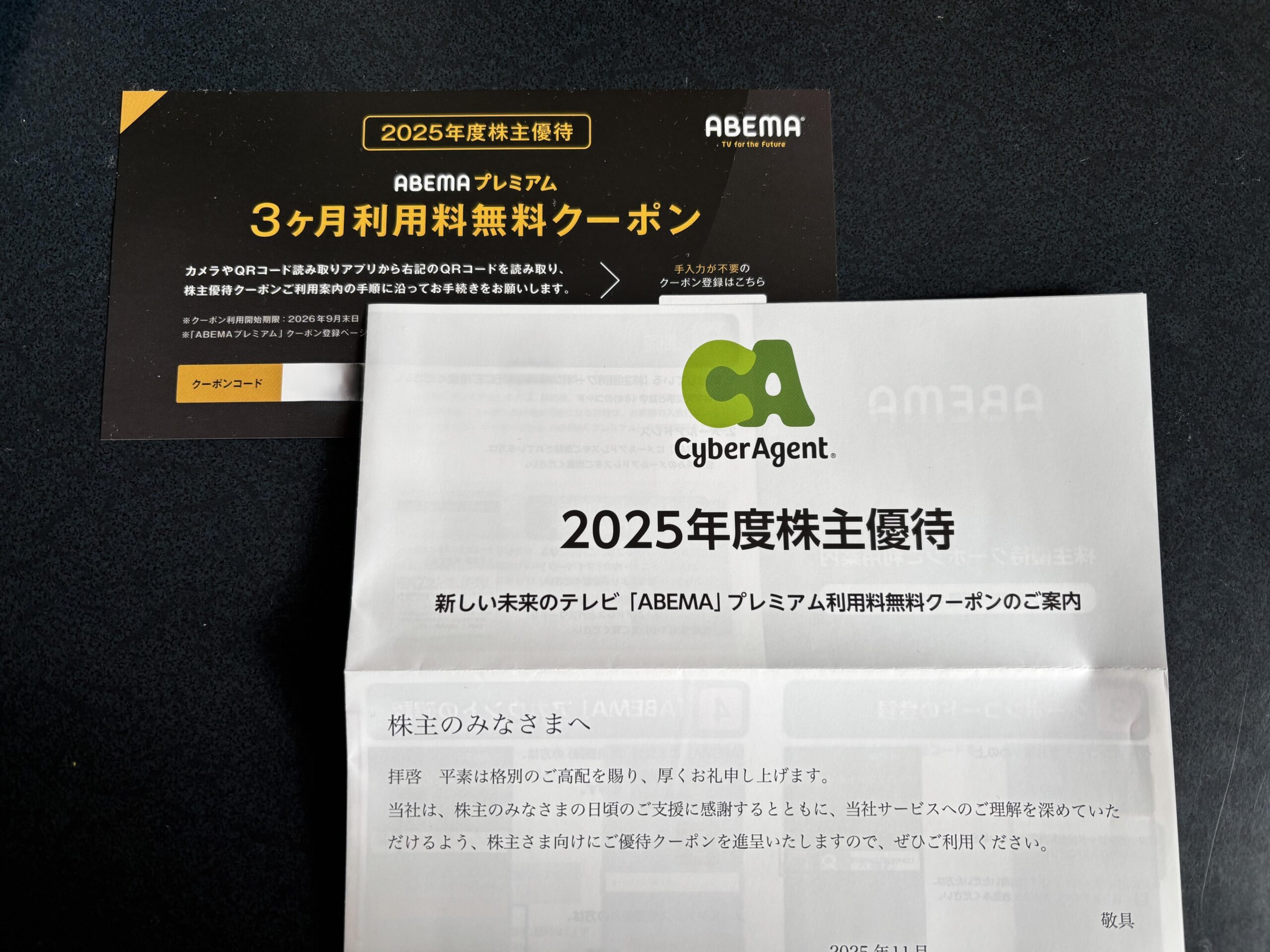 お楽しみの2025年度株主優待は、「ABEMAプレミアム3ヵ月利用料無料クーポン」