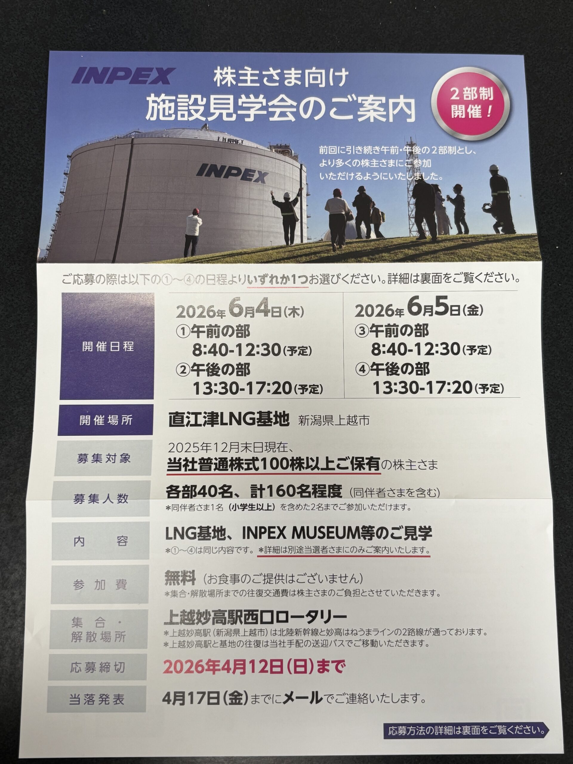 株主さま向け施設見学会のご案内が同封されていました